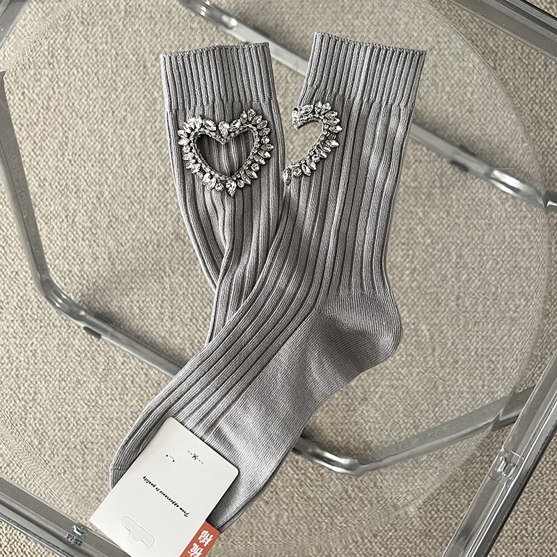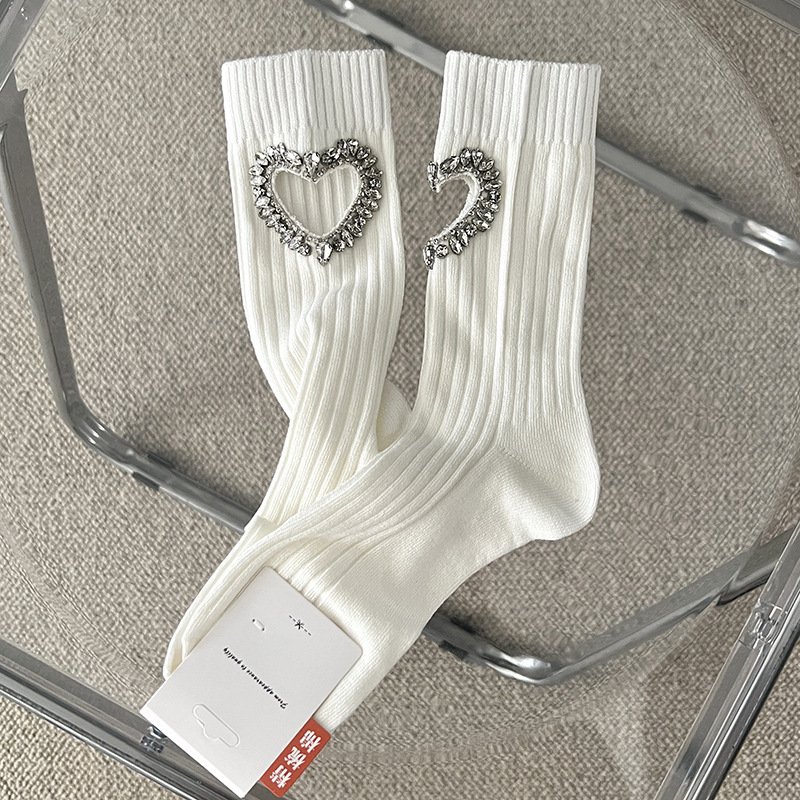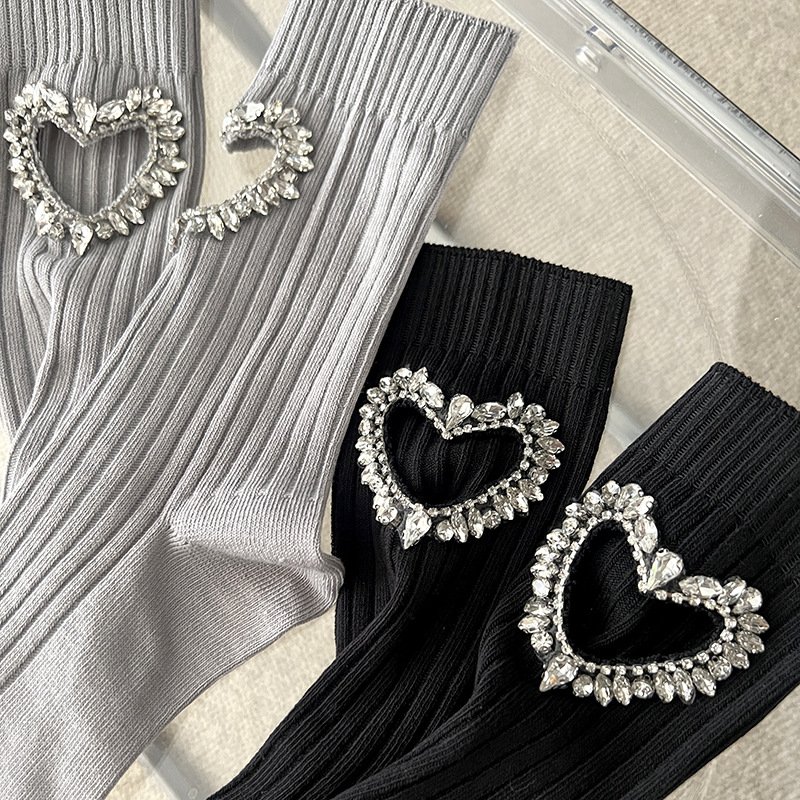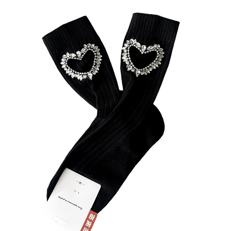 Diamond-encrusted hollowed-out heart-shaped cotton socks